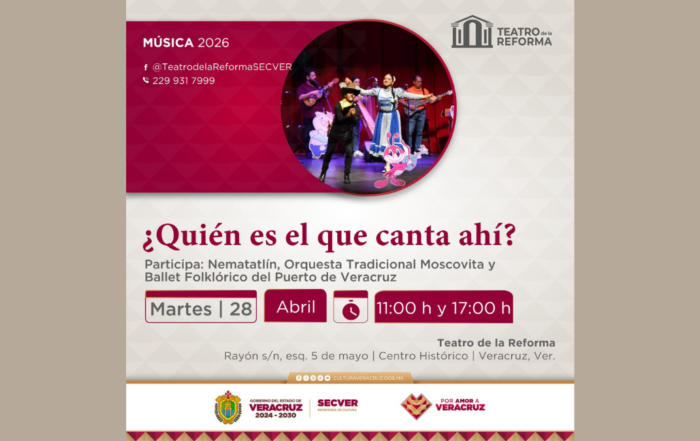 La Secretaría de Cultura de Veracruz, en colaboración con la Dirección General de Difusión Cultural de la Universidad Veracruzana (UV), invita a la presentación artística ¿Quién es el que canta ahí? el próximo martes 28 [...]