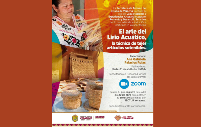 La Secretaría de Turismo (SECTUR) invita a participar en el curso El arte del lirio acuático: técnica para tejer artículos sostenibles, que se llevará a cabo el martes 21 de abril a las 11:00 horas, [...]