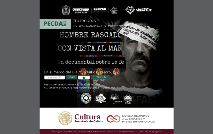 La Secretaría de Cultura de Veracruz (SECVER), en coordinación con el Programa de Estímulos a la Creación y Desarrollo Artístico (PECDA), invita a la obra escénica "Hombre rasgado con vista al mar", en el marco [...]