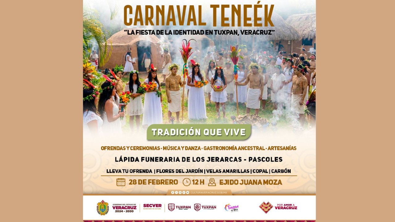La Secretaría de Cultura de Veracruz, en colaboración con la Dirección de Turismo del Ayuntamiento de Tuxpan, invita a disfrutar del Carnaval Teneék, La fiesta de la identidad en Tuxpan, este sábado 28 de febrero a las 12:00 horas, en el Ejido Juana Moza. La entrada es gratuita.