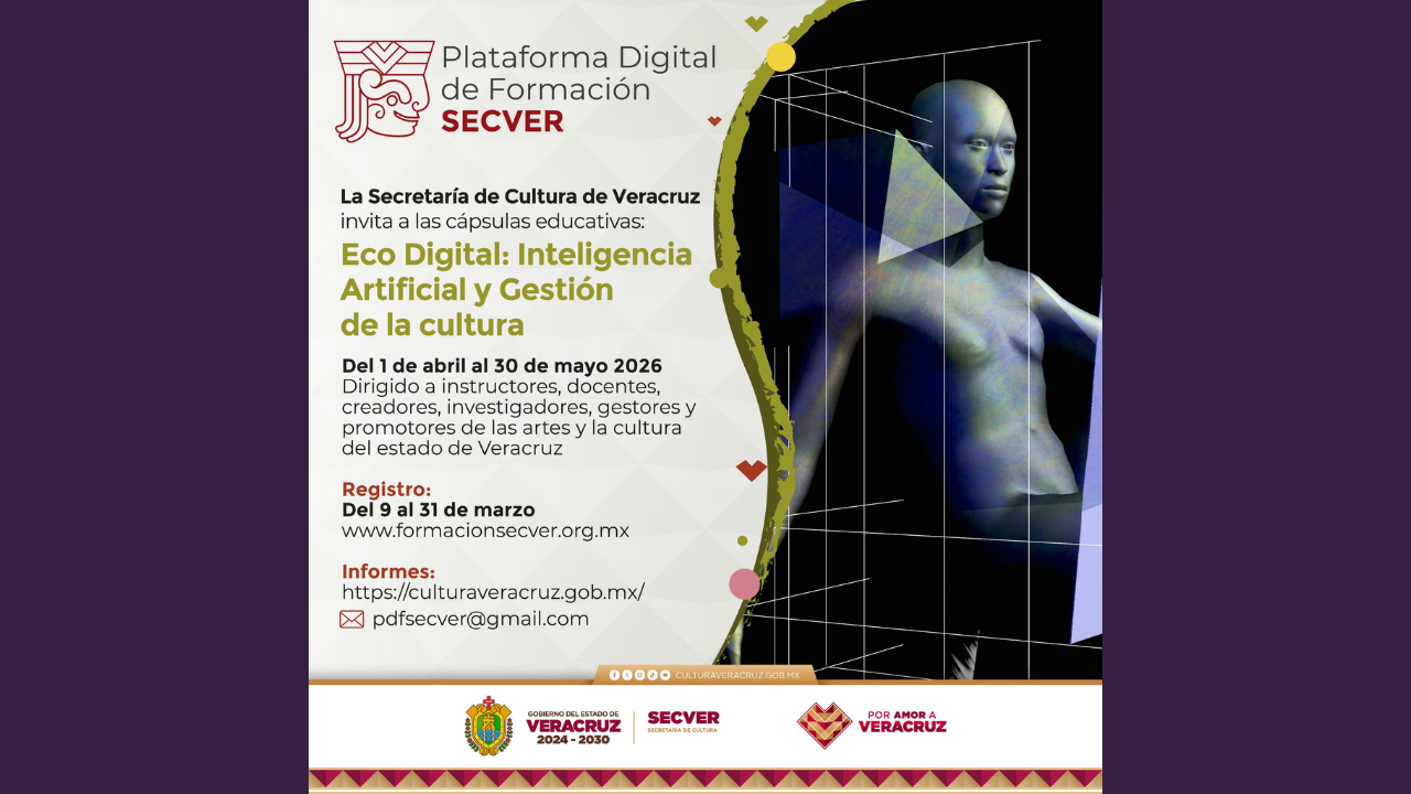 La Secretaría de Cultura de Veracruz (SECVER) invita al público a participar en la serie de cápsulas educativas Eco Digital: Inteligencia Artificial y Gestión de la Cultura 2026, que se transmitirá del 07 de abril al 30 de mayo a través de la Plataforma Digital de Formación SECVER, disponible en el portal https://www.formacionsecver.org.mx/.