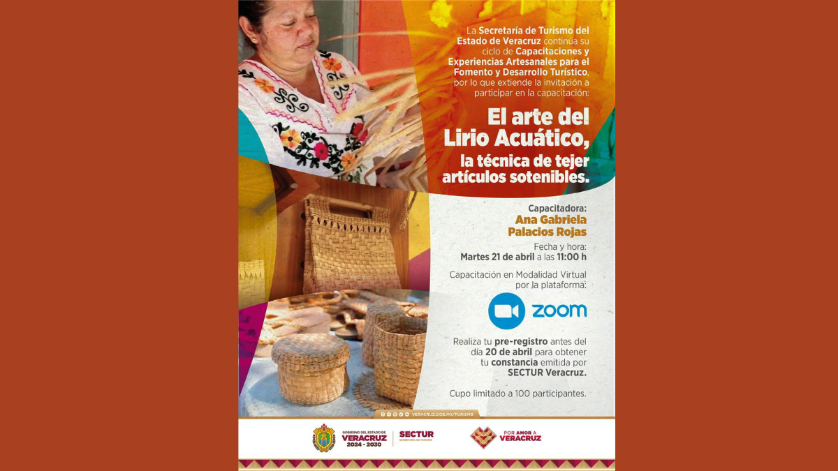 La Secretaría de Turismo (SECTUR) invita a participar en el curso El arte del lirio acuático: técnica para tejer artículos sostenibles, que se llevará a cabo el martes 21 de abril a las 11:00 horas, como parte del ciclo Capacitaciones y experiencias artesanales para el fomento y desarrollo turístico.