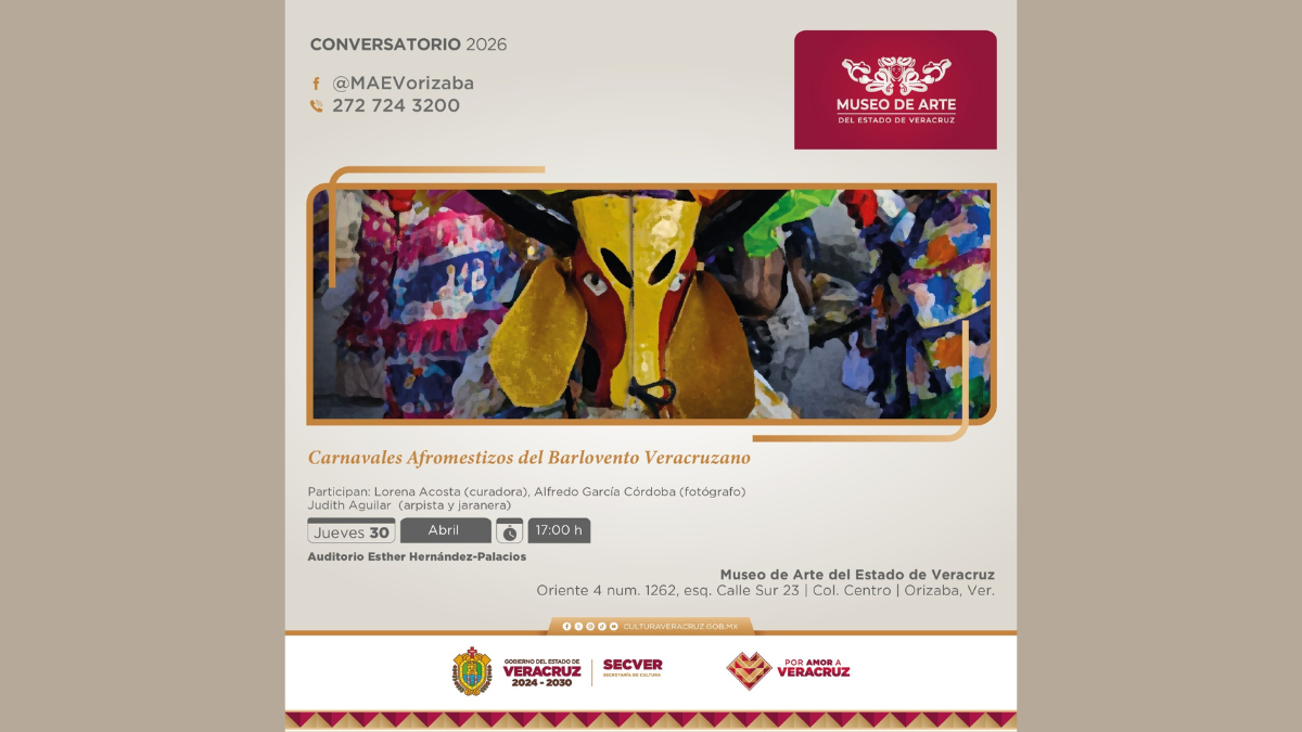 La Secretaría de Cultura de Veracruz invita a conocer la exposición Carnavales afromestizos del Barlovento veracruzano, del 30 de abril al 30 de agosto en la Sala Permanente de Arte Popular del Museo de Arte del Estado de Veracruz (MAEV), en Orizaba, de martes a domingo, en horario de 9:30 a 18:00 horas. La entrada es gratuita.
