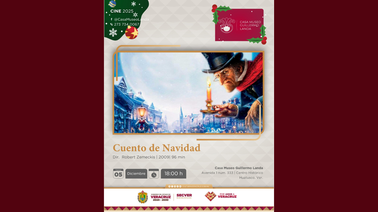 La Secretaría de Cultura de Veracruz (SECVER), invita a toda la familia a las proyecciones fílmicas que se realizarán en la Casa Museo Guillermo Landa de la ciudad de Huatusco, los días 05 y 19 de diciembre, a las 18:00 horas. La entrada es gratuita. Este viernes 05, se llevará a cabo la proyección Cuento de Navidad (2009), una adaptación de la novela homónima de Charles Dickens, realizada por el director Robert Zemeckis en 95 minutos. Para el viernes 19, se presentará Santa Claus (1959), un clásico navideño dirigido por el director mexicano René Cardona, que evoca los recuerdos y [...]