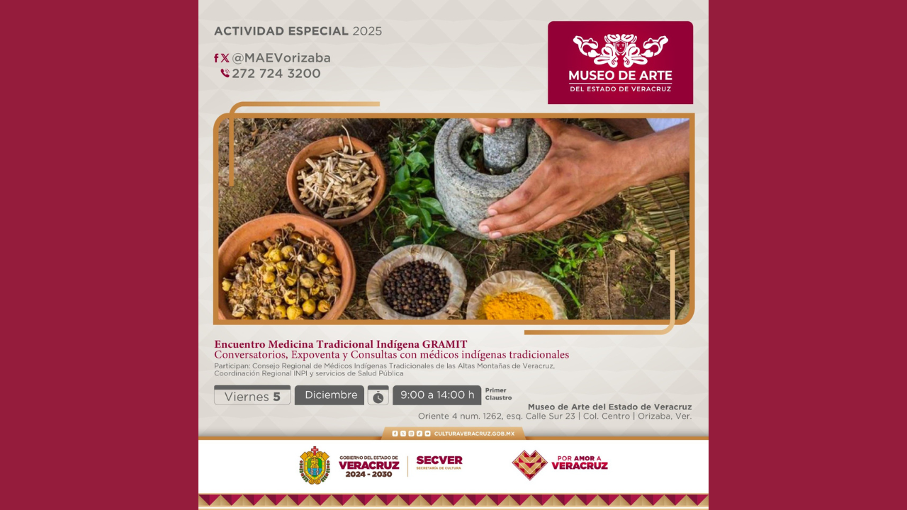 La Secretaría de Cultura de Veracruz (SECVER) invita al Encuentro de Medicina Tradicional Indígena de las Altas Montañas, que se llevará a cabo este viernes 5 de diciembre, de 09:00 a 14:00 horas, en el Museo de Arte del Estado de Veracruz (MAEV), en colaboración con el Consejo Regional de Médicos Indígenas Tradicionales de las Altas Montañas, la Coordinación Regional INPI y Servicios de Salud Pública. Participarán 14 médicos tradicionales indígenas de Zongolica, Ixhuatlancillo, Coscomatepec, Nogales y la comunidad de Necoxtla, del municipio de Camerino Z. Mendoza, cuyas prácticas cuentan con parámetros validados por Cofepris y la Organización Panamericana de [...]