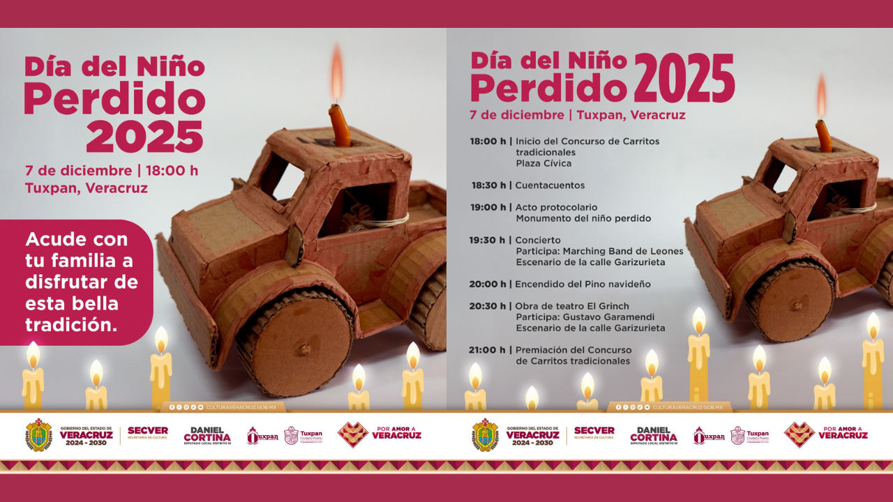 La Secretaría de Cultura de Veracruz, en coordinación con el Ayuntamiento de Tuxpan, invita a participar en las actividades gratuitas para celebrar el tradicional Día del Niño Perdido, este domingo 7 de diciembre, con lo que contribuye a fortalecer el sincretismo cultural de la región huasteca y promover la convivencia familiar. La celebración iniciará a las 18:00 horas con el Concurso de Carritos tradicionales, donde niñas y niños de 4 a 12 años podrán participar para ganar uno de los tres premios económicos mediante sus capacidades creativas y habilidades de diseño. Las inscripciones estarán abiertas hasta sábado 6 de diciembre [...]