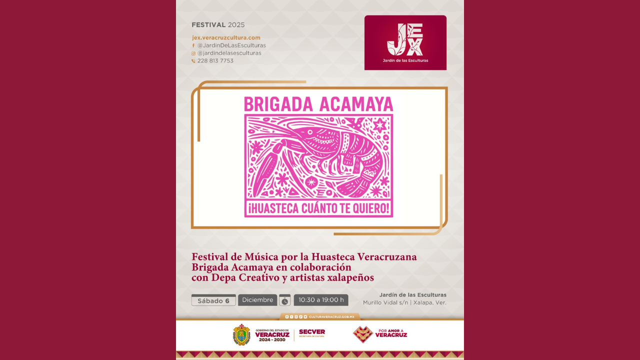 La Brigada Acamaya, el Colectivo Bugambilia y el Depa Creativo invitan al público al Festival de Música por la Huasteca, que se llevará a cabo el día sábado 6 de diciembre en la explanada del Jardín de las Esculturas de Xalapa (JEX), recinto de la Secretaría de Cultura de Veracruz (SECVER), de 10:30 a 19:00 horas. Mediante una programación amplia y diversa, apta para toda la familia, que incluye música de géneros como el jazz, la música latinoamericana, el son huasteco, el son jarocho y el rap, así como una oferta de talleres, se creará un espacio cultural solidario para [...]