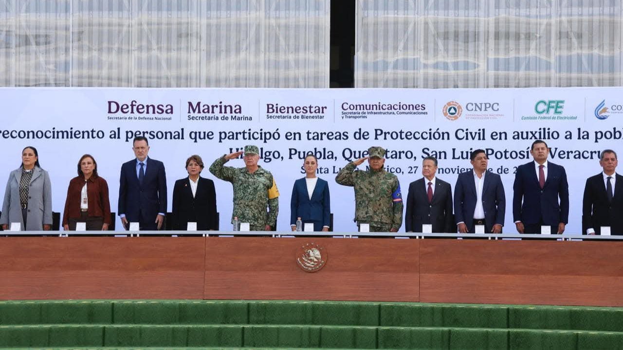 La gobernadora Rocío Nahle García participó en la Ceremonia de reconocimiento al personal que participó en la aplicación del Plan DN-III-E y Plan Marina en Hidalgo, Puebla, Querétaro, San Luis Potosí y Veracruz, encabezada por la presidenta Claudia Sheinbaum Pardo en la Base Aérea Militar Número 1. A nombre del pueblo de Veracruz, la Mandataria expresó su profundo agradecimiento a quienes intervinieron en las labores de auxilio, rescate y restablecimiento de servicios esenciales ante la emergencia ocasionada por las lluvias extraordinarias de octubre. Destacó la entrega del personal de las Fuerzas Armadas, así como la coordinación del Gobierno de México [...]
