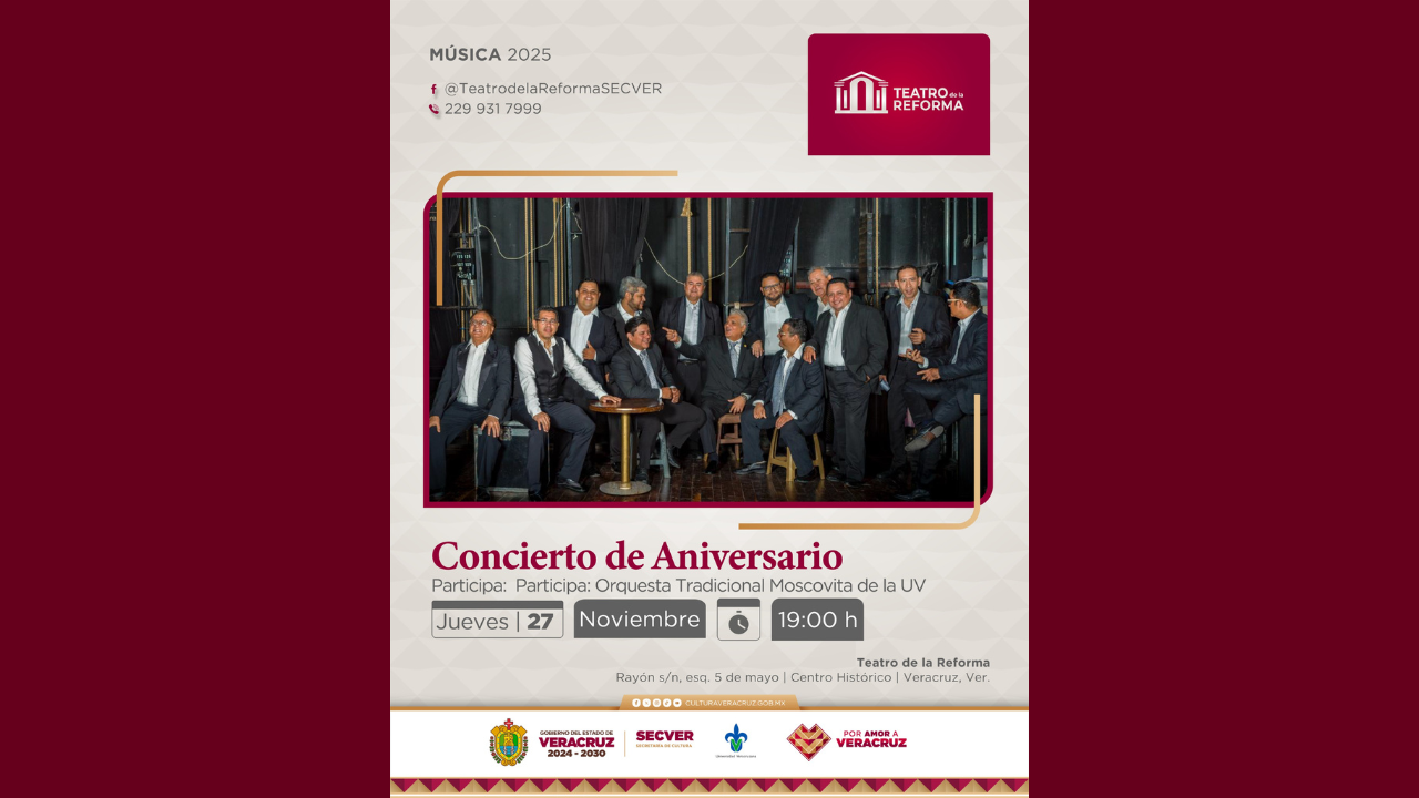 La Secretaría de Cultura de Veracruz (SECVER), en colaboración con la coordinación regional de Difusión Cultural y Extensión Universitaria de la Universidad Veracruzana (UV), invita al Concierto del 45° Aniversario de la Orquesta Tradicional Moscovita, el próximo jueves 27 a las 19:00 horas, en la Sala Principal del Teatro de la Reforma, en el puerto de Veracruz. La entrada será libre. En 1980 se crea la Orquesta Tradicional Moscovita, bajo la dirección de Pedro Domínguez Castillo, músico veracruzano conocido en el ambiente artístico como Moscovita. Más tarde, su apodo se incluiría en el nombre de la agrupación para honrar su [...]