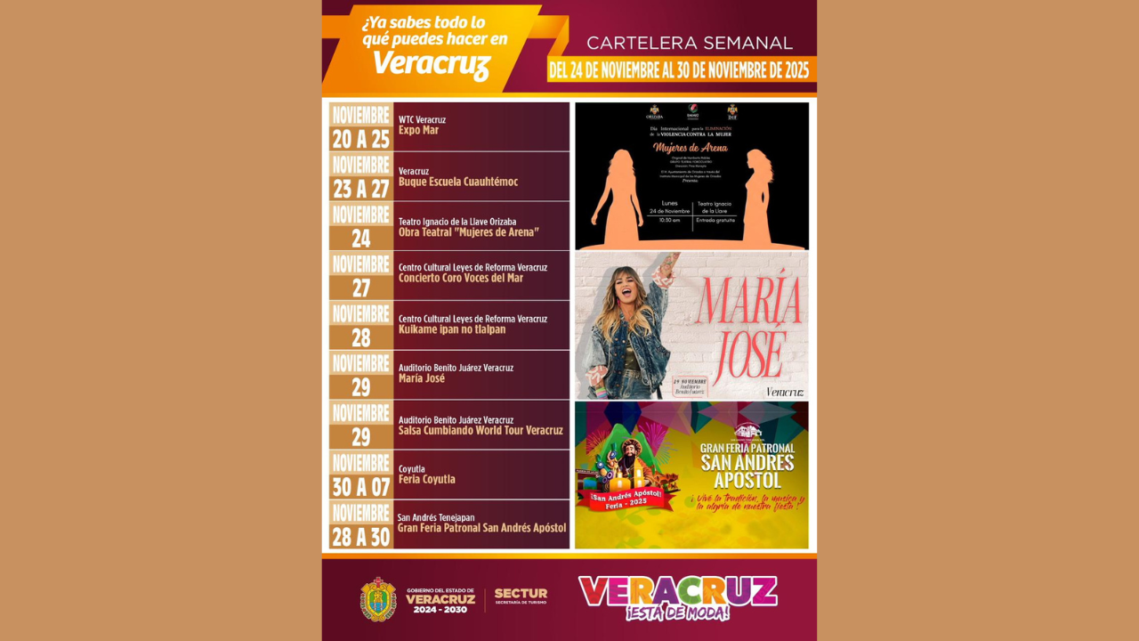 A partir de hoy y hasta el día 30, la Secretaría de Turismo (SECTUR) invita a disfrutar una semana llena de actividades culturales, artísticas y festivas que muestran la diversidad de Veracruz. En el WTC de Veracruz continúa la Expo Mar, abierta hasta el día de mañana, espacio que reúne a expositores, empresas y proyectos relacionados con el sector marítimo y portuario. Hasta el día 27, el público podrá visitar el Buque Escuela Cuauhtémoc, uno de los orgullos de la Marina Armada de México, anclado en el puerto de Veracruz y abierto para recorridos educativos. En el ámbito musical, el [...]