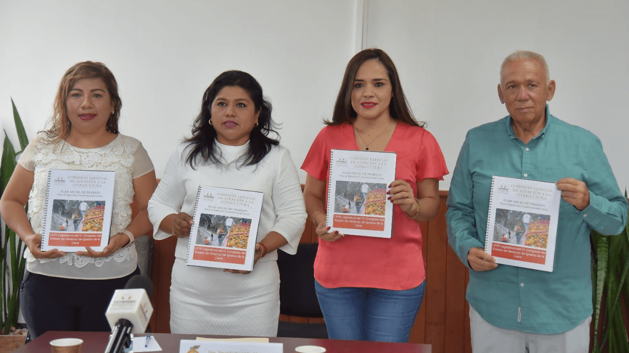 Además, sus integrantes avalan la iniciativa de Ley Citrícola que será presentada al Pleno en sesión próxima. La Comisión Especial para la Atención a la Citricultura de la LXVII Legislatura, integrada por la diputada Imelda Garrido Alvarado, presidenta, diputado Urbano Bautista Martínez, secretario, y por las legisladoras Liud Herrera Félix, Montserrat Ortega Ruiz y María Elena Córdova Molina, vocales; aprobó su Plan Anual de Trabajo, en cumplimiento a lo dispuesto por el párrafo cuarto del artículo 38 de la Ley Orgánica y la fracción IV del artículo 57 del Reglamento para el Gobierno Interior, ambos del Poder Legislativo del estado. [...]