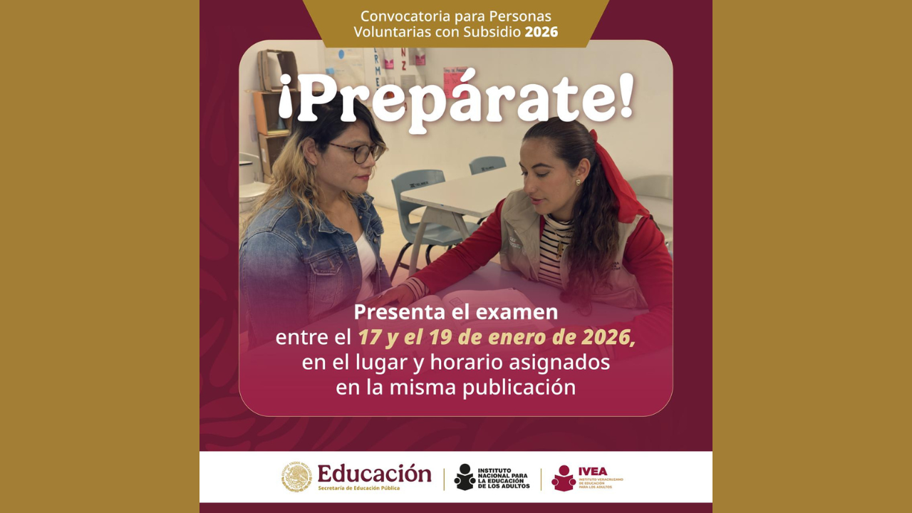Publicará resultados de evaluación el próximo 21 de enero. El Instituto Veracruzano de Educación para los Adultos (IVEA) convoca a participar en el examen de evaluación que se aplicará del 17 al 19 de enero, dirigido a las personas interesadas en integrarse al programa de Personas Voluntarias con Subsidio y desempeñarse como asesores educativos. El programa del IVEA brinda alfabetización, así como educación primaria y secundaria, a personas de 15 años y más en situación de rezago educativo. Por ello, desde el 14 de enero, en la liga https://www.ivea.gob.mx/2026/01/resultados-de-la-etapa-i-y-ii-de-la-primera-convocatoria-2026/, las personas interesadas podrán ubicar su folio correspondiente, así como los datos [...]