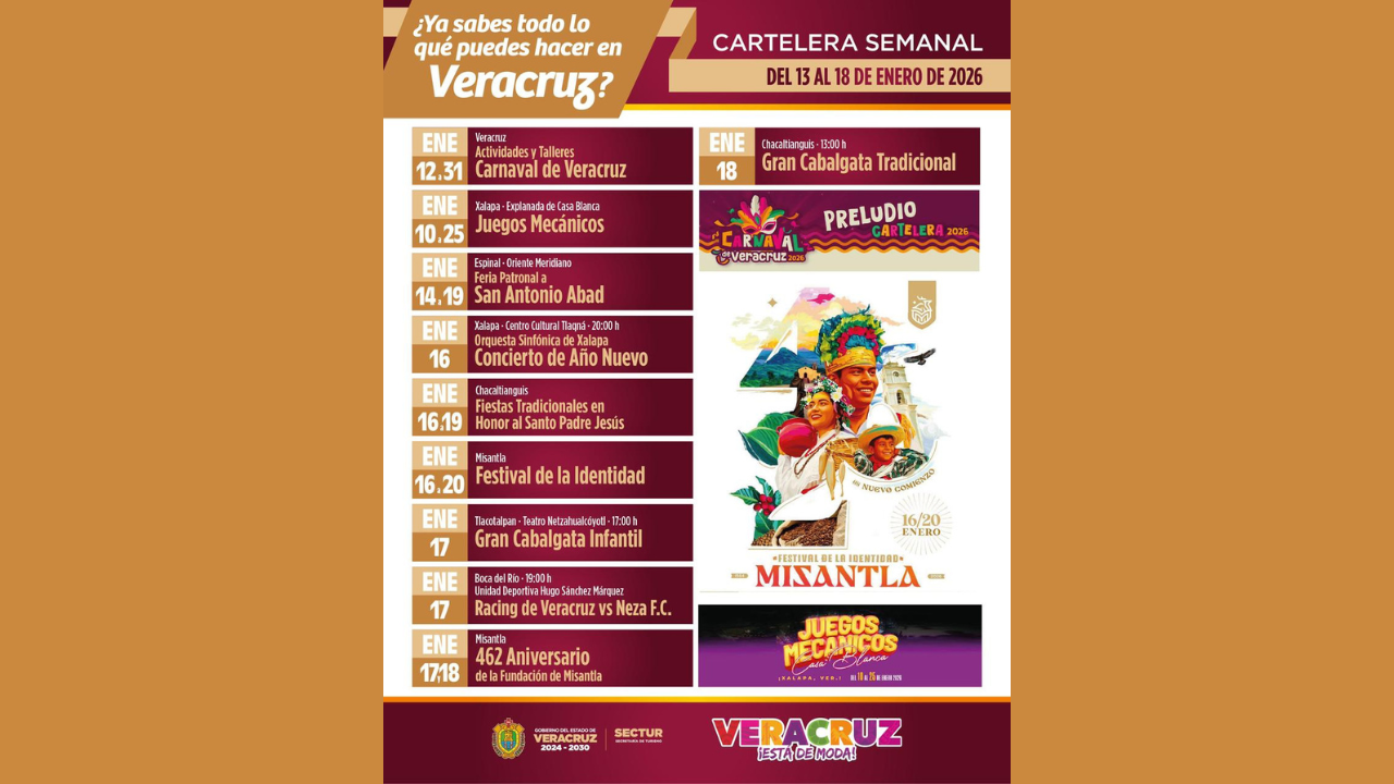 La Secretaría de Turismo (SECTUR) invita a la ciudadanía y visitantes nacionales e internacionales a disfrutar de la diversidad de actividades que ofrece Veracruz en los próximos días, la cual integra eventos culturales, artísticos, tradicionales y deportivos, en distintos municipios del estado. Del 15 al 25, en la explanada de Casa Blanca en Xalapa, juegos mecánicos para la diversión de todas las edades; mientras que del 15 al 19, la Feria Patronal de San Antonio Abad, en el municipio de Espinal. El viernes 16, en el Centro Cultural Tlaqná, la Orquesta Sinfónica de Xalapa ofrecerá su Concierto de Año Nuevo, [...]
