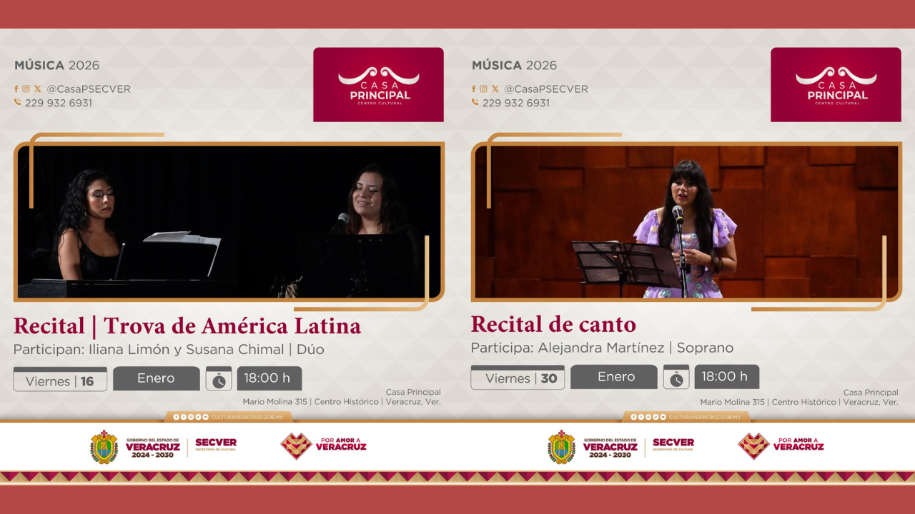 La Secretaría de Cultura de Veracruz (SECVER) invita al público a asistir al ciclo de recitales musicales que tendrán lugar los viernes 16 y 30 de enero, a las 18:00 horas, en el Centro Cultural Casa Principal, en el puerto de Veracruz. La entrada es libre. Trova de América Latina es el primero, con la participación especial del dúo formado por Iliana Limón y Susana Chimal. Este evento musical propone un recorrido por la trova y la canción latinoamericana como una forma de poesía cantada, donde la música se convierte en un puente de diálogo con la comunidad. La segunda [...]
