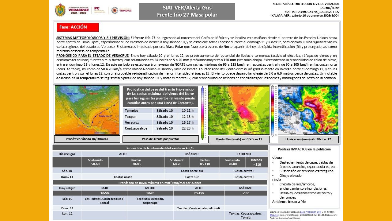La Secretaría de Protección Civil mantiene activa la Alerta Gris del Sistema de Alerta Temprana de Veracruz (SIATVer), en su Fase de Acción, debido a los efectos del Frente Frío 27. Este sábado se presentó un evento de Norte fuerte en las costas central y norte, el cual se prolongará durante la noche y la madrugada, con una disminución gradual de su intensidad a partir del domingo. En la región sur, se prevé desde hoy y hasta el lunes 12 un incremento en el potencial de lluvias significativas, acompañadas de tormentas eléctricas y rachas de viento. Se estiman acumulados de [...]