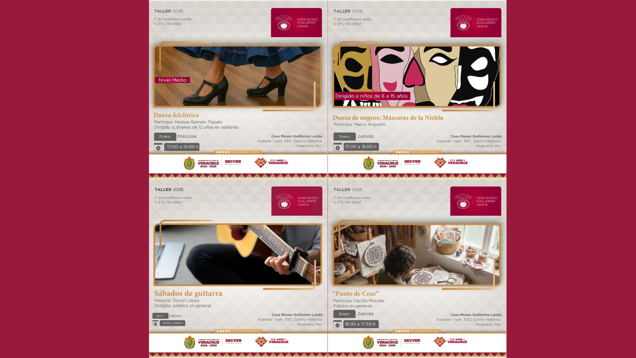 La Secretaría de Cultura de Veracruz (SECVER) invita la comunidad en general a integrarse a la oferta de talleres durante enero en la Casa Museo Guillermo Landa, en Huatusco. Las actividades son gratuitas y aptas para todo público. Los lunes, a las 17:00 horas, se lleva a cabo el taller de Danza folclórica, a cargo de Melissa Galindo. Los jueves, a la misma hora, Cecilia Morales impartirá el Taller de punto de cruz, mientras que Marco Argüello impartirá el de Danza de los Negros, dirigido a niñas y niños. Finalmente, los sábados a las 17:00 horas, Daniel Solabac dirigirá, [...]