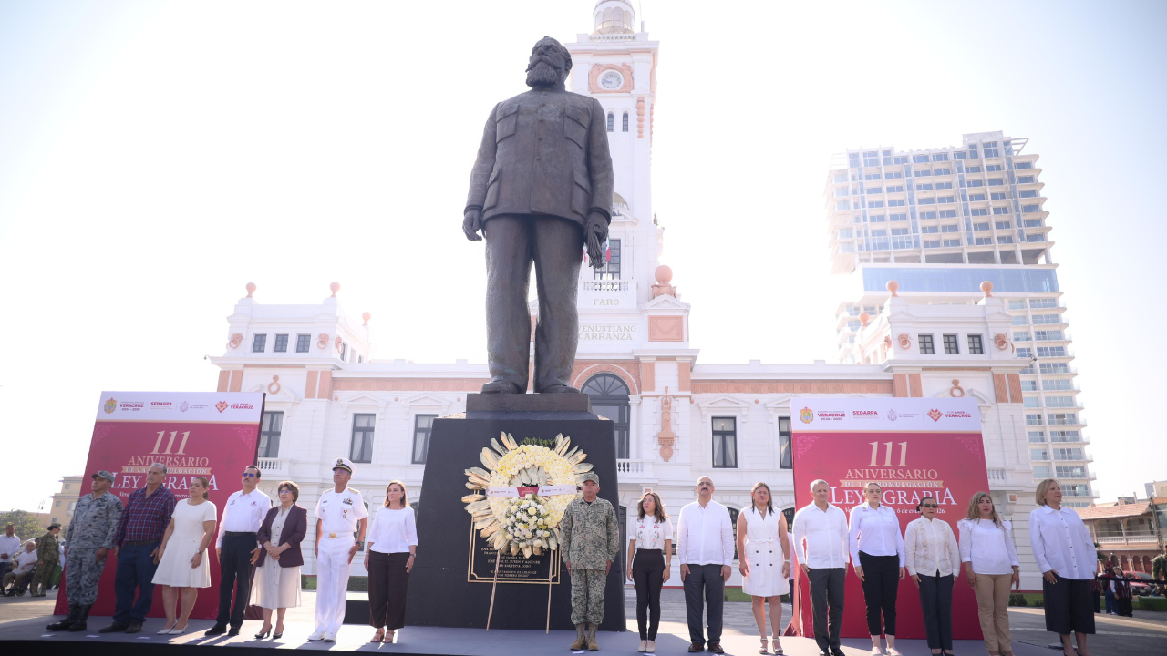 Sector agropecuario genera 40% de la economía estatal. El Salmoral, fundado en 1923, cuna del primer ejido del país. Con una guardia de honor y el depósito de ofrenda floral ante el monumento a Venustiano Carranza, la gobernadora Rocío Nahle García, junto con autoridades de los tres órdenes de gobierno, conmemoró el 111 aniversario de la promulgación de la Ley Agraria. Destacó que su administración impulsa una producción agrícola eficiente y sustentable, avanza en la regularización jurídica de ejidos y comunidades, y fortalece la inversión, la capacitación y la comercialización de los productos del campo. “Con organización, acompañamiento institucional y [...]