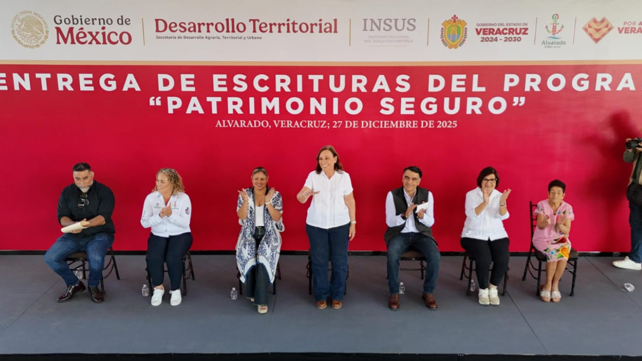 Veracruz, el estado con mayor avance nacional en regularización de suelo durante la actual administración. “No es un tema menor entregar una propiedad legalmente; es hacer justicia social y dar tranquilidad a las familias”, afirmó la gobernadora Rocío Nahle García al encabezar en Alvarado la entrega de 336 escrituras del programa Patrimonio Seguro, en coordinación con el Instituto Nacional del Suelo Sustentable (INSUS). Subrayó el respaldo del Gobierno de México, encabezado por la presidenta Claudia Sheinbaum Pardo, para avanzar en la regularización del suelo y la vivienda en Veracruz, “la indicación es clara: no esperar y entregar a la gente [...]