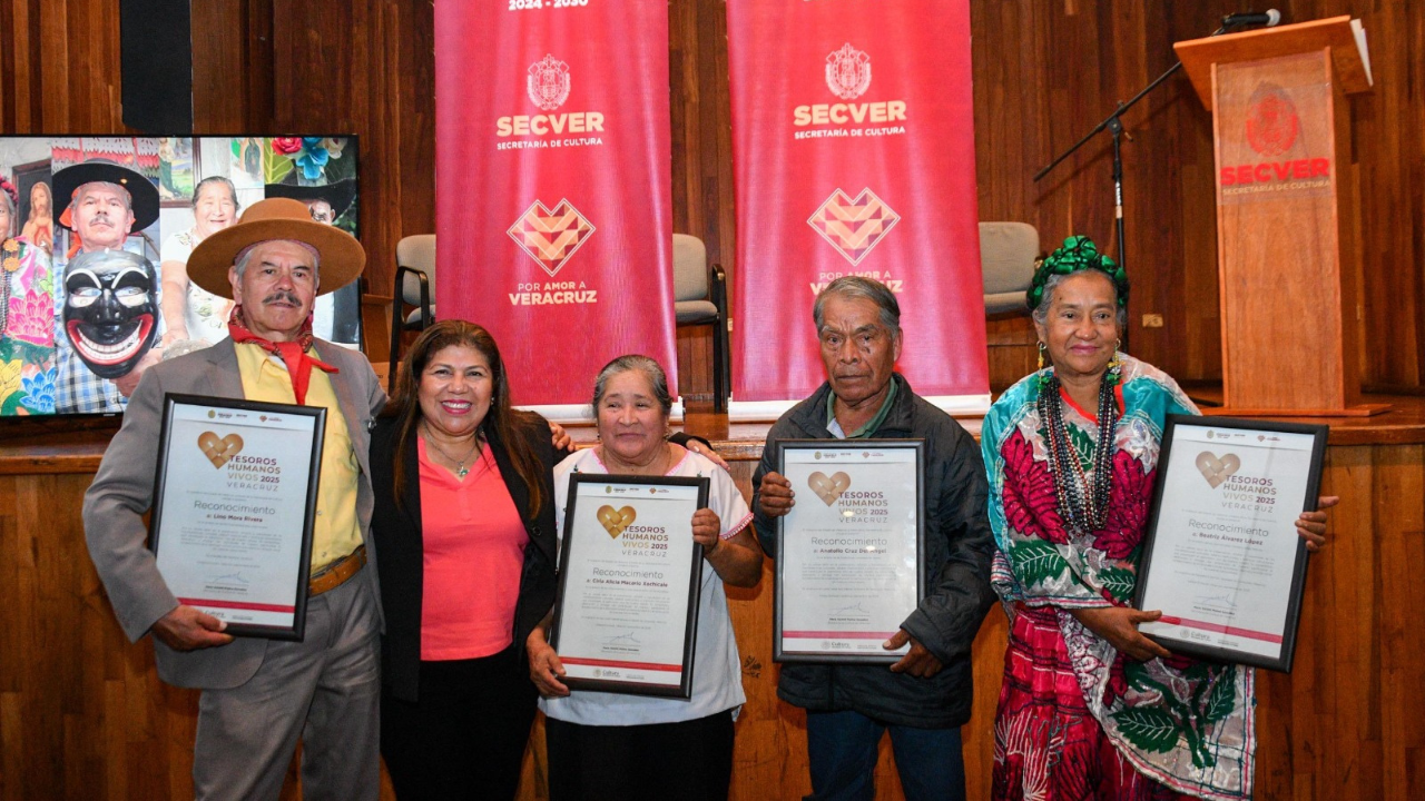 La Secretaría de Cultura de Veracruz (SECVER) entregó el reconocimiento Tesoros Humanos Vivos Veracruz 2025, a quienes con su dedicación cotidiana mantienen la memoria viva y fortalecen el legado cultural de las comunidades del estado. En la emotiva ceremonia celebrada en la Galería de Arte Contemporáneo de Xalapa, se distinguió a quienes resguardan, practican y transmiten los saberes, conocimientos y expresiones que otorgan identidad a los pueblos originarios. Recibieron reconocimientos Ciria Alicia Macario Xochicale, partera tradicional y dadora de vida; Anatolio Cruz del Ángel, por su aporte al patrimonio cultural comunitario; Lino Mora Rivera, por la creación de máscaras tradicionales, [...]