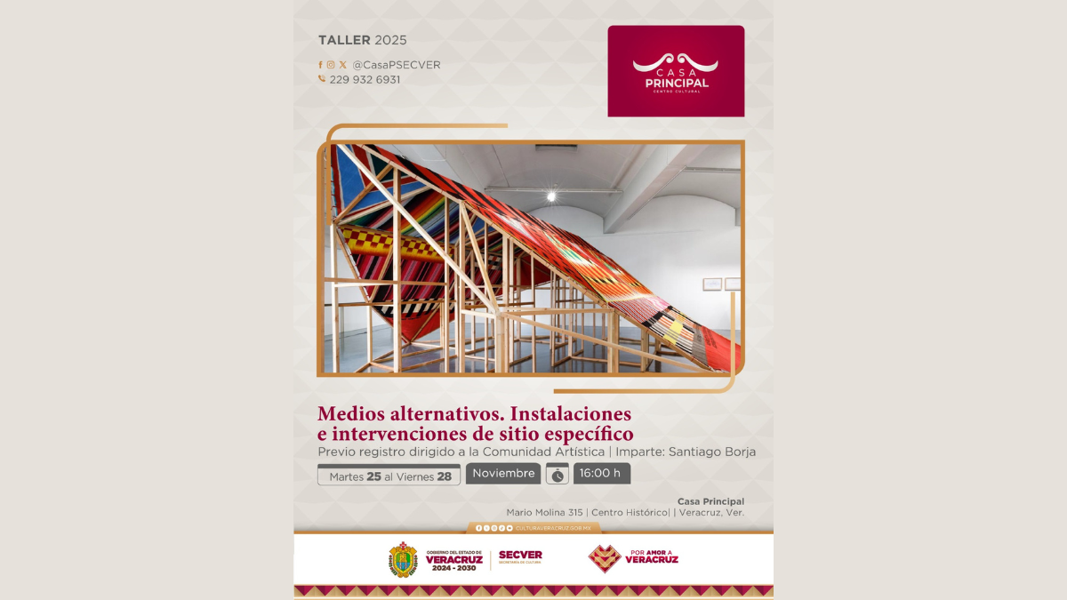 La Secretaría de Cultura de Veracruz (SECVER) invita al público interesado en el arte contemporáneo a participar en el taller teórico-práctico Medios Alternativos. Instalaciones e intervenciones de sitio específico, que se realizará del 25 al 28 de noviembre, en horario de 17:00 a 20:00 horas, en el Centro Cultural Casa Principal, en el puerto de Veracruz. El cupo es limitado. El taller propone un análisis historiográfico de los principales hitos de este arte, desde los gabinetes de curiosidades hasta la estética relacional, para comprender cómo las instalaciones e intervenciones han transformado la noción de espacio expositivo y la experiencia del [...]