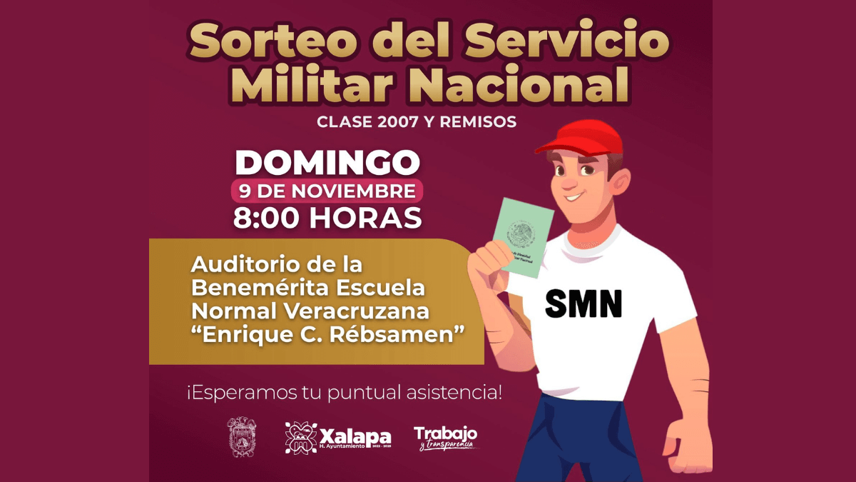 El Ayuntamiento de Xalapa, a través de la Secretaría y la Junta Municipal de Reclutamiento, invita a jóvenes de la Clase 2007 y Personal Remiso al Sorteo del Servicio Militar Nacional, el cual se llevará a cabo el domingo 9 de noviembre a las 8:00 horas, en el auditorio de la Benemérita Escuela Normal Veracruzana “Enrique C. Rébsamen”. Se recomienda asistir con pantalón de mezclilla color azul; camisa o playera blanca y calzado cómodo, así como no llevar objetos punzocortantes, mochilas, hebillas grandes en cinturones o botellas de vidrio. Se contará con punto de hidratación, pero es importante que los [...]