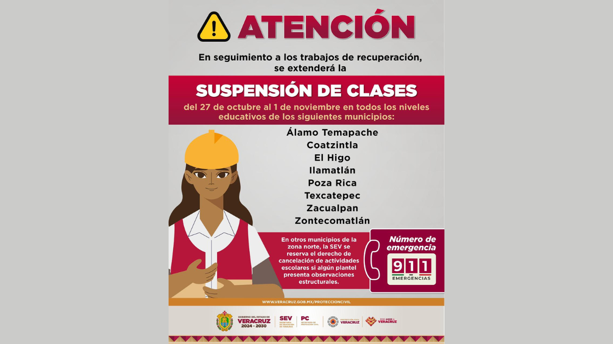 En seguimiento a los trabajos de recuperación en la zona norte, el Comité Estatal de Emergencias, en coordinación con la Secretaría de Educación de Veracruz (SEV), informa que se extiende la suspensión de clases y actividades escolares en todos los niveles educativos de ocho municipios, del 27 de octubre al 01 de noviembre: Álamo, Temapache, Coatzintla,El Higo, Ilamatlán, Poza Rica, Texcatepec, Zacualpan, Zontecomatlán La SEV indica que, se reserva el derecho de cancelación de actividades escolares si algún plantel de otros municipios de la zona norte presentara observaciones estructurales. Por su parte, la Secretaría de Protección Civil reitera a la [...]