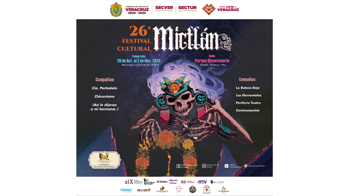 La Secretaría de Cultura de Veracruz (SECVER), en coordinación con la Asociación de Artistas Independientes de Xalapa AIX A.C., el Ayuntamiento de Xalapa, el Instituto Veracruzano de la Juventud, Radiotelevisión de Veracruz, así como la iniciativa privada, enaltece y preservar las tradiciones de la región capital como el 26° Festival Cultural Mictlán que se llevará a cabo del martes 28 de octubre al domingo 2 de noviembre de 2025. Se llevarán a cabo funciones y recorridos en el Parque Bicentenario de Xalapa, a partir de las 18:30 horas. Este Festival, único en su tipo, reúne a compañías de artistas independientes [...]