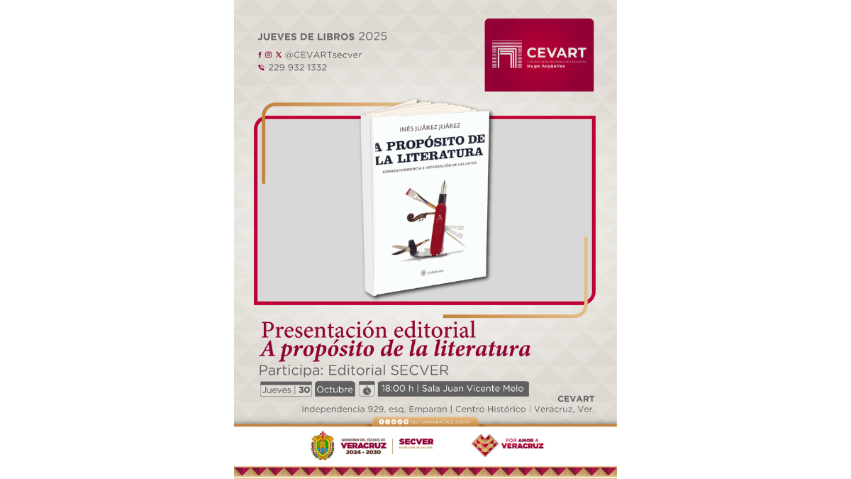 La Secretaría de Cultura de Veracruz (SECVER) invita a participar en las actividades del mes de octubre relativas al programa de fomento a la lectura El Sabor de la Lectura, las cuales tendrán lugar en distintos recintos culturales. Como parte del programa El Sabor de la Lectura, el día jueves 23 se llevará a cabo la presentación editorial del libro A propósito de la literatura de la autoría de Inés Juárez Juárez, a las 17:00 horas, en el Centro Cultural de Coatepec. Contará con la participación de Ana Ortiz y Ricardo Prior para entablar un diálogo entre el libro y [...]