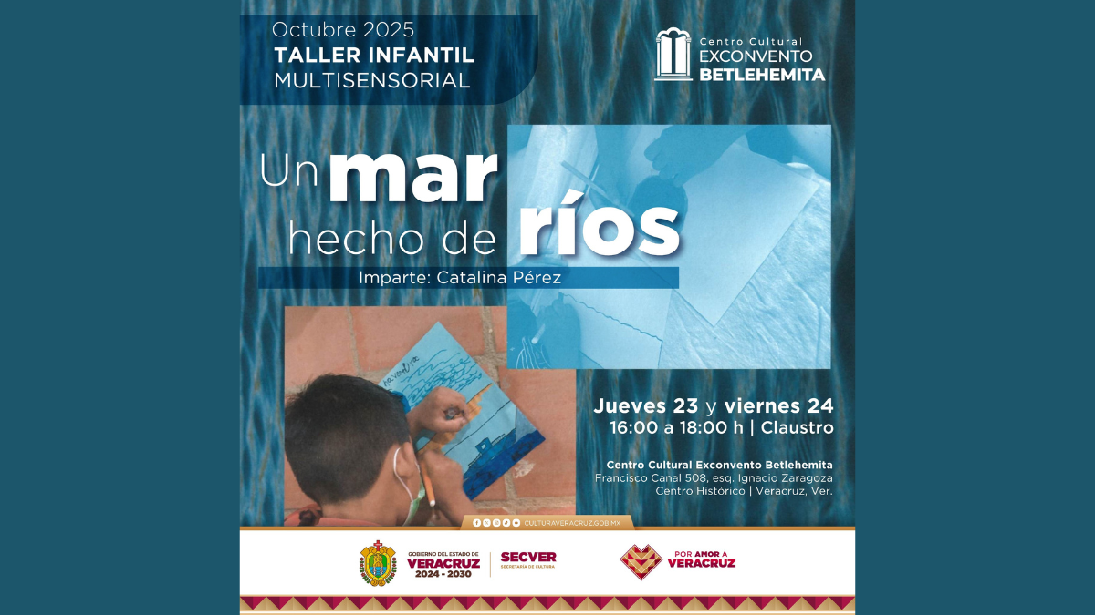 La Secretaría de Cultura de Veracruz (SECVER) invita al público a participar en actividades gratuitas en torno a la publicación Hacemos nuestro río, editada por Casa Gallina, en el Centro Cultural Exconvento Betlehemita del jueves 23 al sábado 25 de octubre. El programa inicia con el taller infantil multisensorial Un mar hecho de ríos, propuesta de activación lúdica y artística que busca acercar a niñas y niños al ecosistema del Golfo de México y a los ríos que lo alimentan, a efectuarse los días jueves 23 y viernes 24 de octubre de 16:00 a 18:00 horas. La actividad tiene como [...]