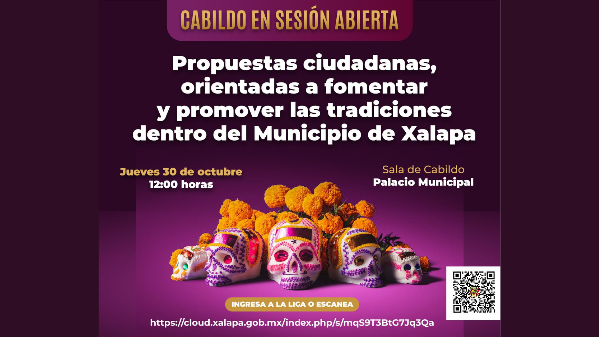 Con el propósito de recibir, escuchar y analizar propuestas ciudadanas orientadas a fomentar y promover las tradiciones en el municipio de Xalapa, el próximo jueves 30 de octubre, a las 12:00 horas, se realizará el quinto Cabildo en Sesión Abierta del año, por lo que se invita a la ciudadanía a participar y presentar sus iniciativas en la materia. Mediante este ejercicio, a través del cual se promueve el diálogo directo entre autoridades y población, así como la participación de la ciudadanía en los actos de gobierno, los integrantes del Cabildo escucharán las propuestas, proyectos y planteamientos de la comunidad [...]