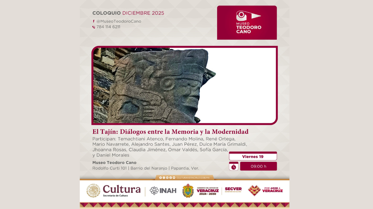 La Secretaría de Cultura de Veracruz (SECVER) invita al público en general a asistir al coloquio El Tajín: Diálogos entre la Memoria y la Modernidad, el viernes 19 de diciembre a las 09:00 horas, en el Museo Teodoro Cano, ubicado en Papantla. La entrada es libre. Este coloquio tiene como objetivo generar un espacio de analisis, discusion y reflexion interdisciplinaria en torno al patrimonio arqueologico. Abordará aspectos relevantes como su conservacion, gestion, riesgos, restauracion y significacion cultural desde distintas miradas academicas y tecnicas, fortaleciendo el diálogo entre la memoria historica y los retos de la modernidad. Contará con la participacion [...]