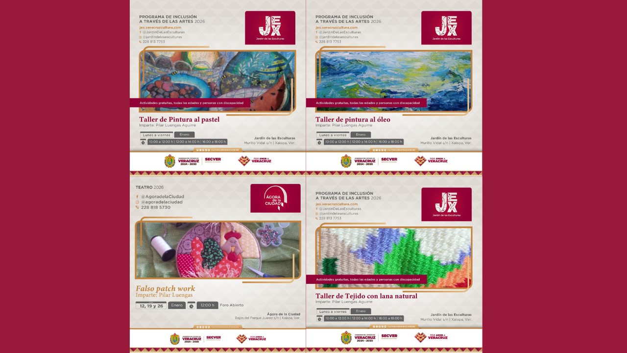 La Secretaría de Cultura de Veracruz (SECVER) invita a participar en los talleres inclusivos del Programa de Inclusión a través de las Artes (PIAA), que se desarrollarán durante el mes de enero en el Jardín de las Esculturas de Xalapa (JEX) y el Ágora de la Ciudad. Todas las actividades son gratuitas. En el JEX se impartirá el taller Pintura al pastel todos los lunes de enero en dos horarios: de 10:00 a 12:00 y de 12:00 a 14:00 horas, así como los martes de 16:00 a 18:00 horas. El taller Pintura al óleo se realizará los miércoles en tres [...]