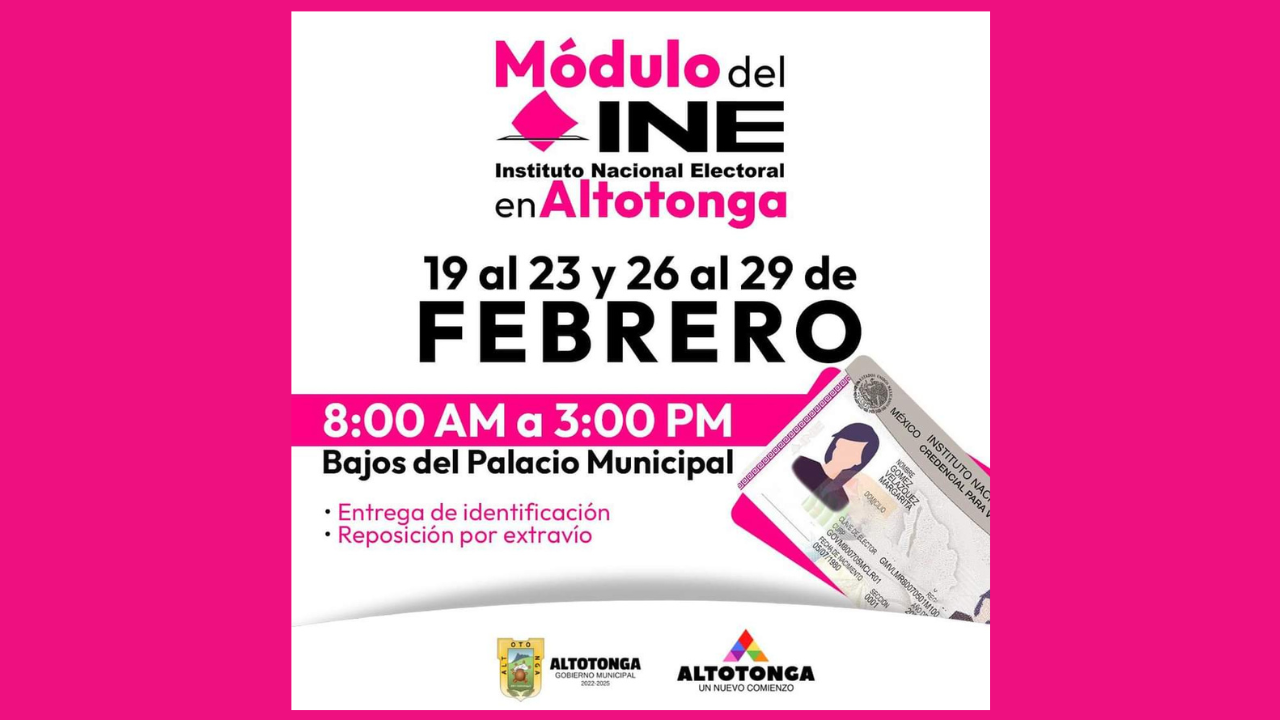 El Ayuntamiento de #Altotonga , informa a la población 18+, sobre la instalación de un módulo del #INE. Se invita a todos los ciudadanos a asistir al módulo. Del 19 al 23 y 26 al 29 de Febrero Palacio Municipal. De 8:00 AM a 3:00 PM ¡Que no se te pase! Solo se estarán realizando reposición por extravío y entrega de identificaciones.
