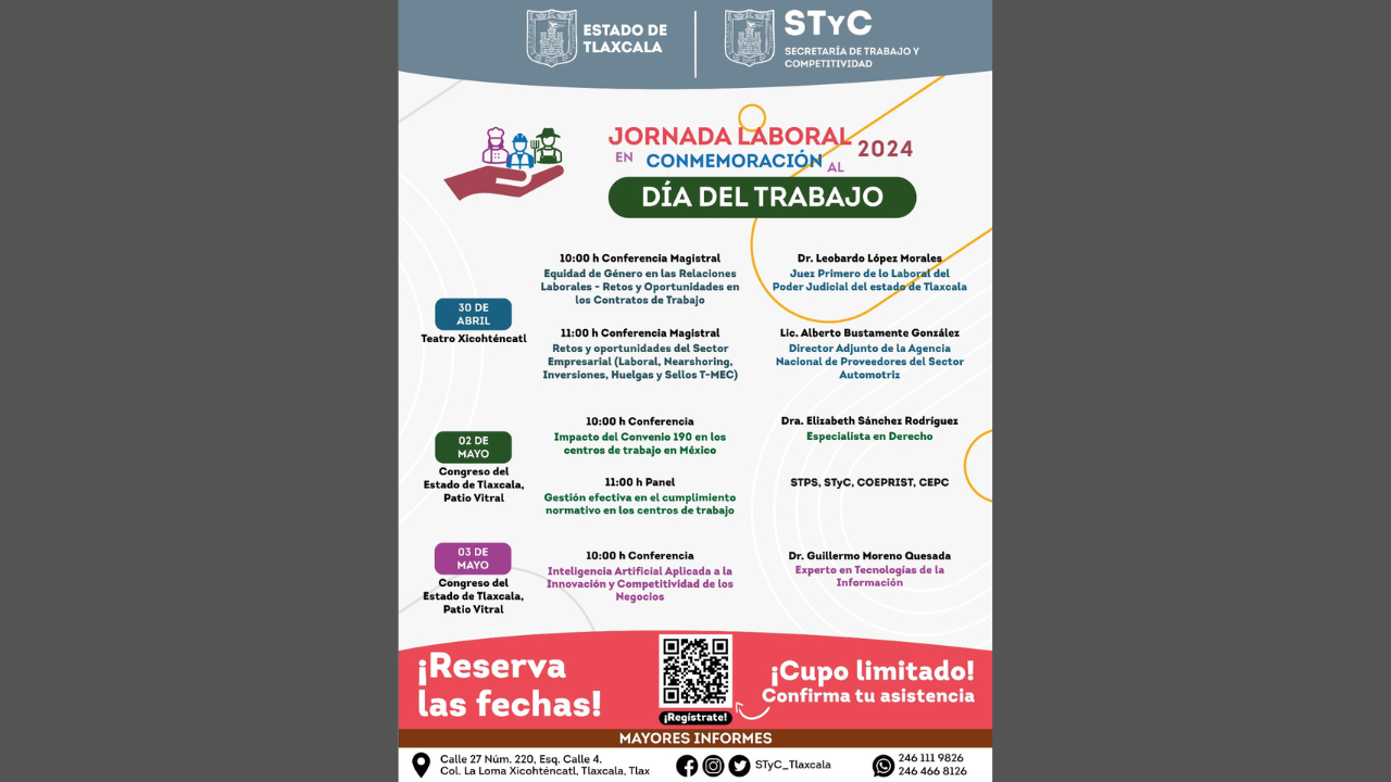 Las actividades se desarrollarán los días 30 de abril, y 2 y 3 de mayo. En el marco del Día Internacional del Trabajo, que se conmemora el 1 de mayo de cada año, la Secretaría de Trabajo y Competitividad (STyC) organizó una serie de actividades, que incluyen un ciclo de conferencias y un panel, en las que se abordarán temas relacionados con el ecosistema laboral. Su objetivo es brindar a los trabajadores y a los empleadores pláticas para mejorar las relaciones al interior de los centros laborales, los beneficios del cumplimiento del marco normativo y la aplicación de la Inteligencia [...]
