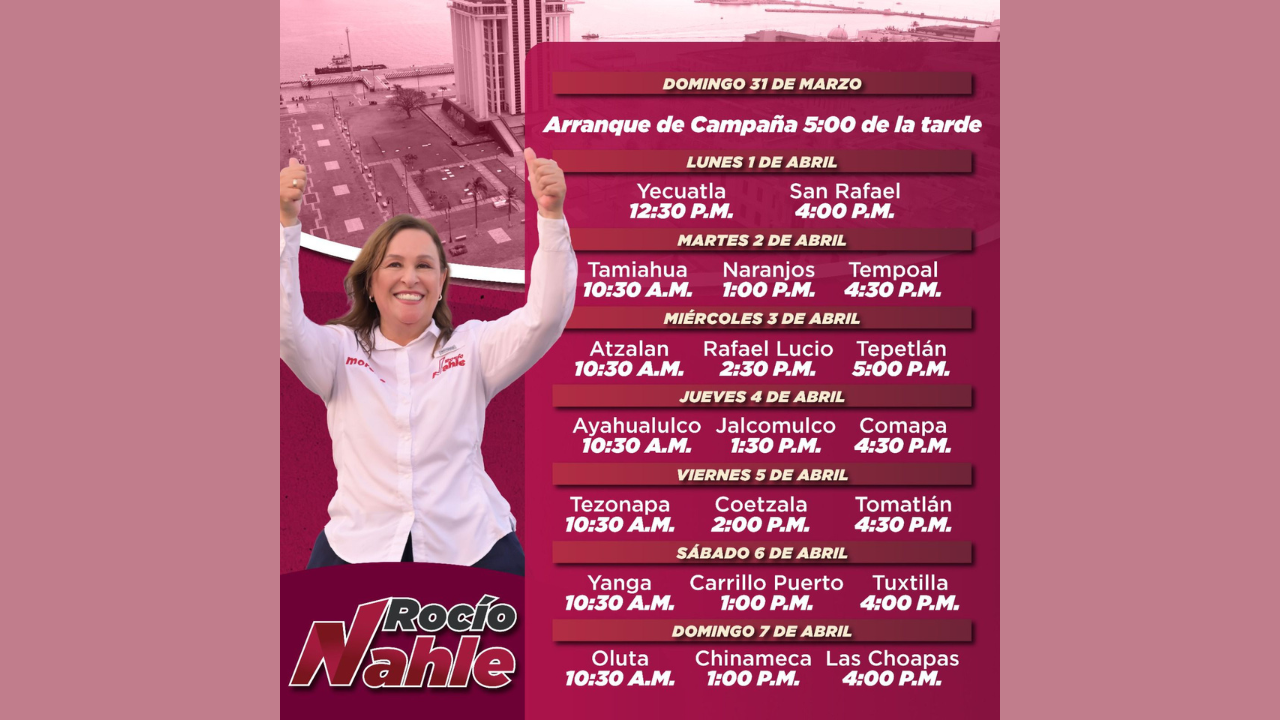 Anuncia #RocíoNahle agenda de primera semana de campaña rumbo la gubernatura @RocioNahle #Veracruz Recorrerá los últimos 108 municipios de los 212 que integran el estado.