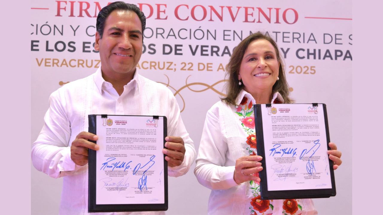 Contempla acciones de inteligencia y cooperación para la paz en el sur-sureste. La gobernadora Rocío Nahle García y su homólogo de Chiapas, Eduardo Ramírez Aguilar, signaron el Convenio de Coordinación y Colaboración en materia de Seguridad, con el propósito de reforzar las estrategias interestatales de prevención, vigilancia y atención ciudadana en beneficio de ambas entidades. Durante su intervención, la Mandataria subrayó que este acuerdo se suma al Plan Nacional de Construcción de Paz, impulsado por la presidenta Claudia Sheinbaum Pardo, “nos permite continuar la estrecha colaboración que hemos mantenido desde el inicio de nuestras administraciones. Todas las instituciones de nuestro [...]