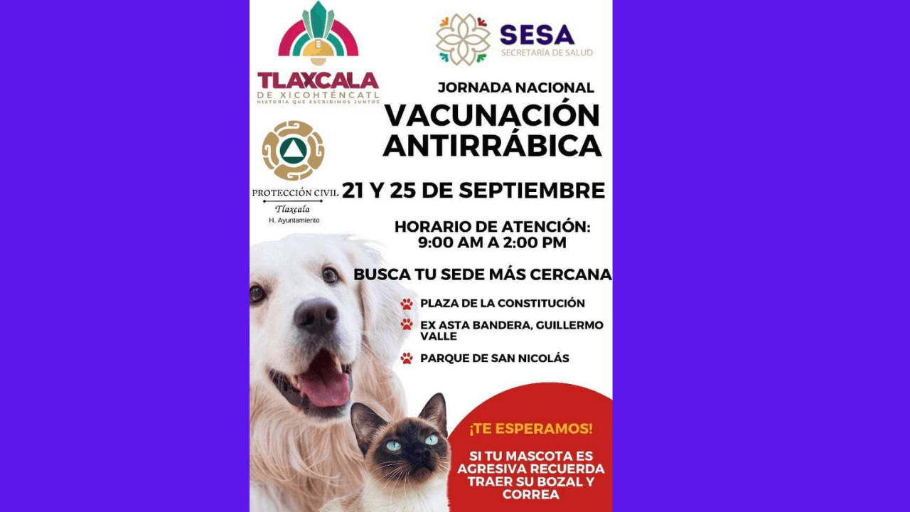 Invitan a participar en la Campaña de Vacunación Antirrábica que se llevará a cabo del 21 al 25 de septiembre. Protege a tus mascotas y contribuye a un entorno más saludable. ¡No faltes! ¡Por una cultura de tenencia responsable de animales de compañía!.