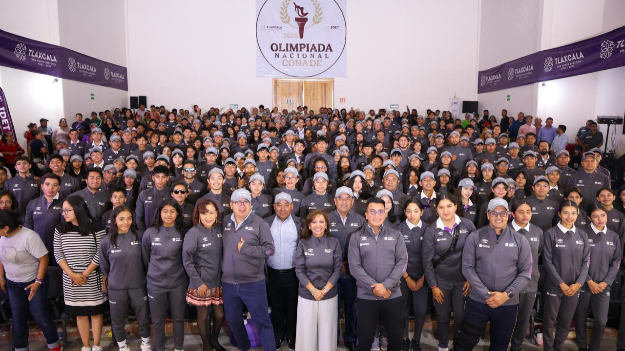 La conforman 279 deportistas y 111 integrantes de equipo multidisciplinario, lo que la hace una selección histórica. La gobernadora Lorena Cuéllar Cisneros realizó el abanderamiento de la delegación tlaxcalteca rumbo a la Olimpiada Nacional CONADE 2025, que se encuentra conformada por 390 integrantes, de los cuales 279 son deportistas y los otros 111 son del equipo multidisciplinario, que participarán del 15 de mayo al 12 de julio en las sedes de Tlaxcala, Jalisco, Colima, Yucatán y Puebla. “Les pido que demos lo mejor, que demostremos de qué están hechos los tlaxcaltecas. ¿De qué estamos hechos? de amor, de muchas ganas [...]