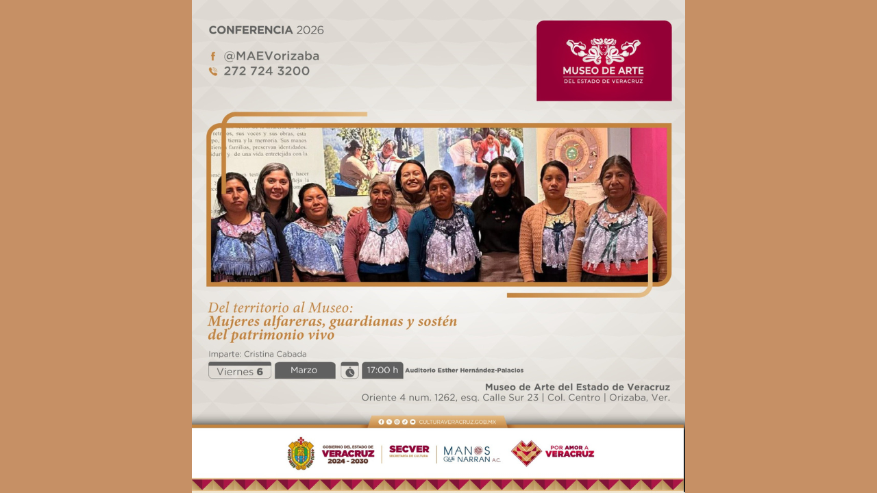 Participará Cristina Cabada en el Museo de Arte de Orizaba. En el marco de la conmemoración del Día Internacional de la Mujer, la Secretaría de Cultura de Veracruz (SECVER) invita a la conferencia Del territorio al museo: mujeres alfareras, guardianas y sostén del patrimonio vivo, el viernes 06 de marzo a las 17:00 horas en el Museo de Arte del Estado de Veracruz (MAEV), en la ciudad de Orizaba. La plática contará con la participación de Cristina Cabada, quien se ha dedicado a investigar sobre el papel y la trascendencia de las artesanas en la Sierra de Zongolica, su desarrollo [...]