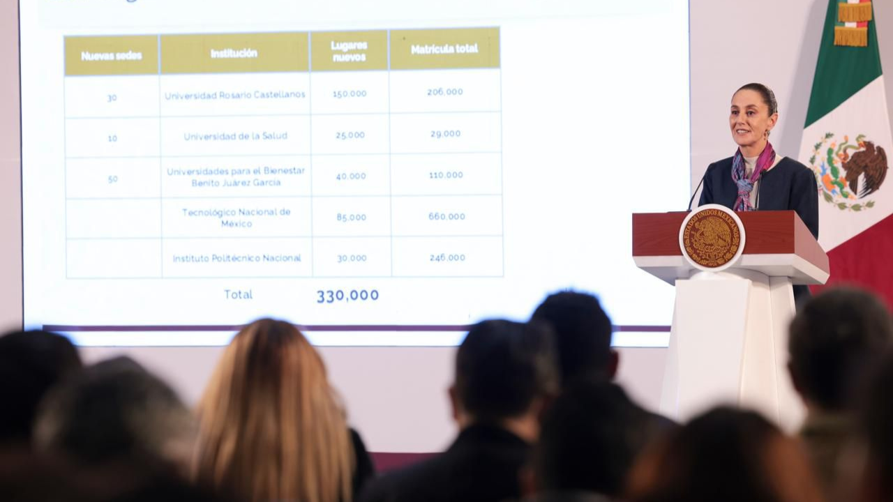 Serán 150 mil nuevos lugares en Universidad “Rosario Castellanos”; 25 mil en Universidad de la Salud; 40 mil en Universidades para el Bienestar “Benito Juárez”; 85 mil en TecNM y 30 mil en IPN. Será en Comitán, Chiapas, y en Tijuana, Baja California donde se abrirán los nuevos planteles de la Universidad de la Salud y de la “Rosario Castellanos”. En noviembre se publica convocatoria para inscripción de estudiantes y contratación de docentes en las Universidades “Rosario Castellanos” y de la Salud. Porque la educación es un derecho y no una mercancía, la Presidenta Constitucional de los Estados Unidos Mexicanos, [...]