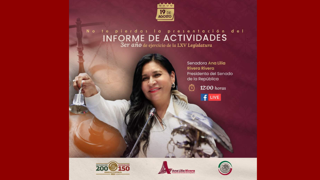 Este lunes 19 de agosto a las 12:00 horas la senadora #AnaLliliaRiveraRivera presenta su informe de actividades legislativas. ¡No se lo pierdan a través de sus redes sociales!.