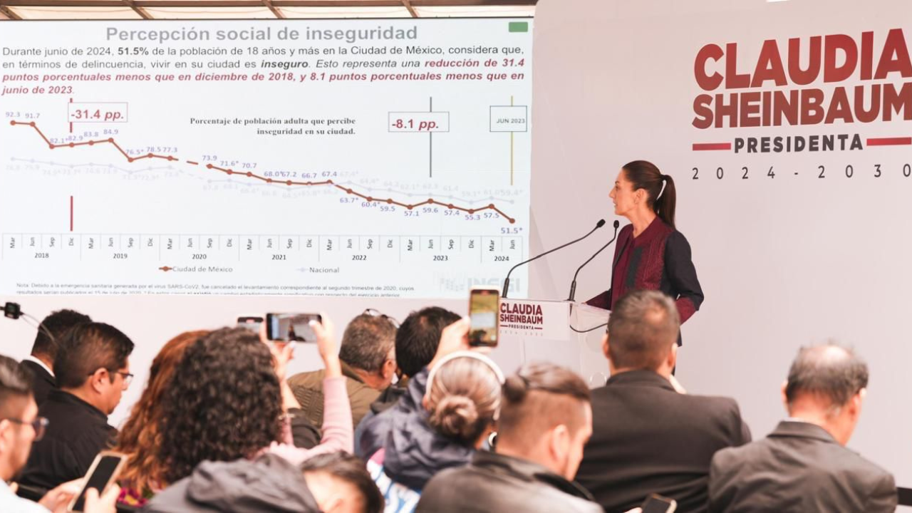 "México ha avanzado en disminución de la inseguridad y vamos a avanzar todavía más", destacó Manifestación de la oposición contra la representación de la 4T en el Congreso, es para pedirle al INE que viole la Constitución, afirmó la virtual Presidenta electa Hoy en día, las mexicanas y mexicanos se sienten más seguros que en 2018, aseguró la virtual Presidenta electa, Claudia Sheinbaum Pardo, tras presentar los resultados de la más reciente Encuesta Nacional de Seguridad Urbana (ENSU) que realiza el Instituto Nacional de Geografía y Estadística (INEGI). "Más allá de los propios datos que claramente muestran la disminución de [...]