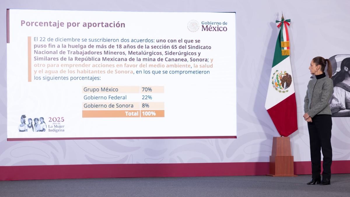 La Presidenta de México, Claudia Sheinbaum Pardo, anunció que en enero de 2026 iniciará la construcción de las obras establecidas en el Plan de Justicia para Cananea, Sonora, las cuales incluyen un nuevo Hospital Regional en Ures, la instalación de potabilizadoras y centros de monitoreo de la calidad del agua. Este avance se da tras concretarse un acuerdo histórico suscrito el 22 de diciembre con los trabajadores mineros de la Sección 65, quienes mantenían una huelga desde hace 18 años. La secretaria de Gobernación, Rosa Icela Rodríguez, detalló que se destinará una inversión conjunta de 2 mil 222.6 millones de [...]